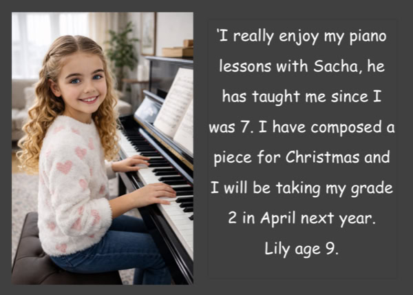“I offer one-to-one piano tuition for children, teenagers, and adults, tailored to each student’s abilities, interests, and goals — whether that’s learning for pleasure, building skills, or preparing for exams and performance.